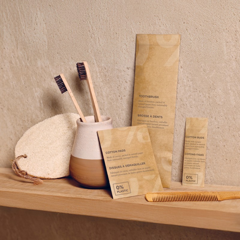 Esponja de banho vegetal - Chinelos - Pente - Escova de dentes - Kit dental - Lenços de papel - Lixa de unhas - Kit de manicure - Cotonetes - Discos de algodão - Luva para sapatos - Estojo de costura