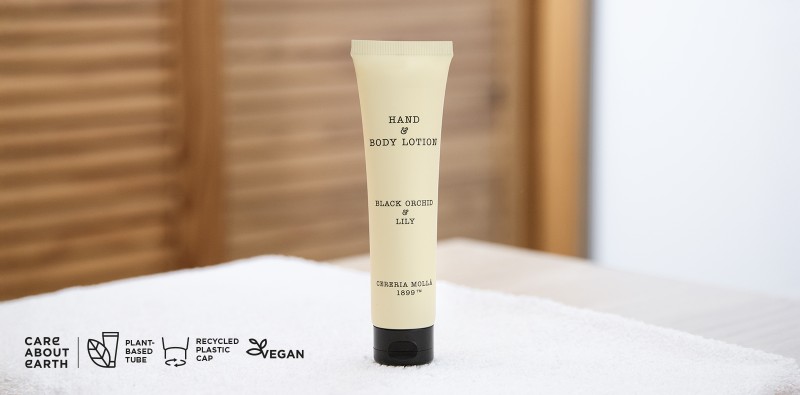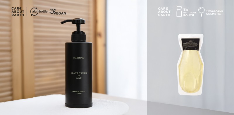 Inclui o sistema Ecofill Slim, um dispensador recarregável patenteado com bolsas seladas de 300 ml, desenvolvido para uma utilização hoteleira segura, eficiente e elegante, que alia estética e responsabilidade ambiental. Um tubo de loção de 30 ml e um sabonete sólido de 20 g completam a oferta.
